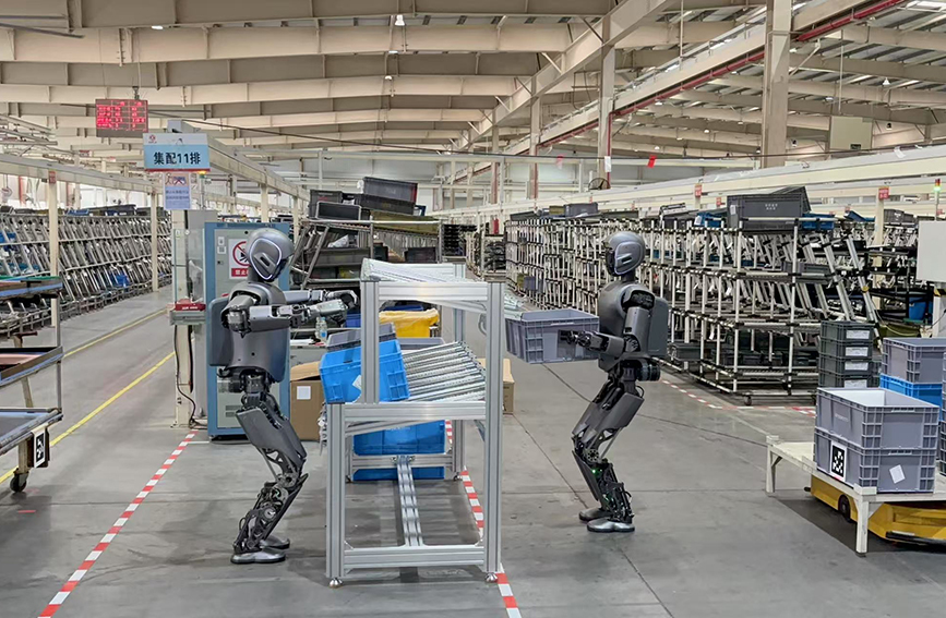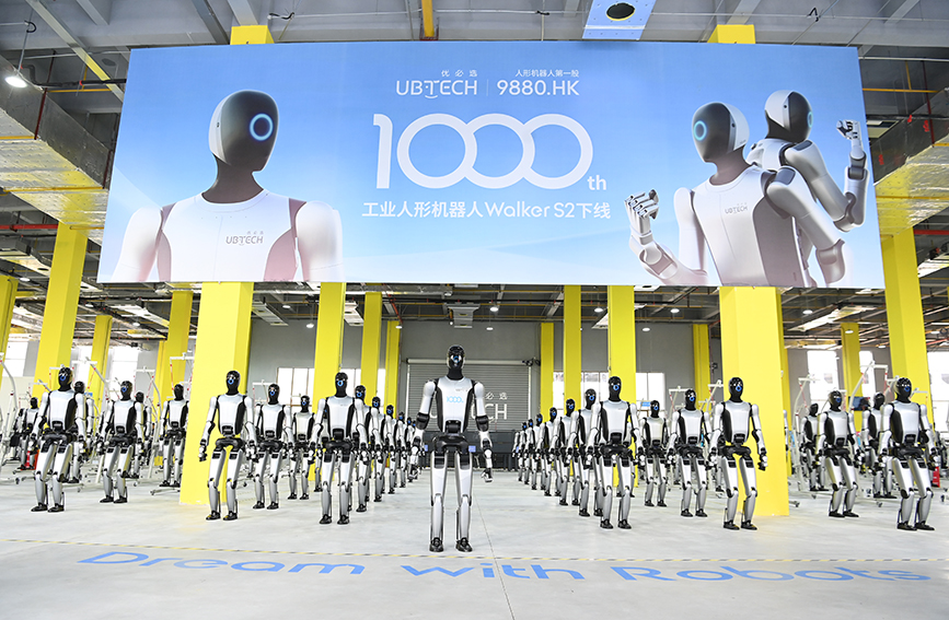 可实现单机自从取群体协同功课,柳州优必选第1000台工业人形机械人Walker S2下线典礼现场。竞跑人工智能新赛道:下线广西首台工业人形机械人,